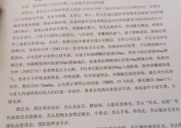 小杨家属质疑,最早到达现场的物理老师未做任何处理,此外,后续进行处理的老师并未拨打120,而是自行开车送医。家属认为,相关行为也使得小杨情况变化、加重:“老师来掐人中还有呼吸反应,然后提着胳膊抬着腿,送医在车上又是坐着的,导致本来心率失常变成心脏骤停。”